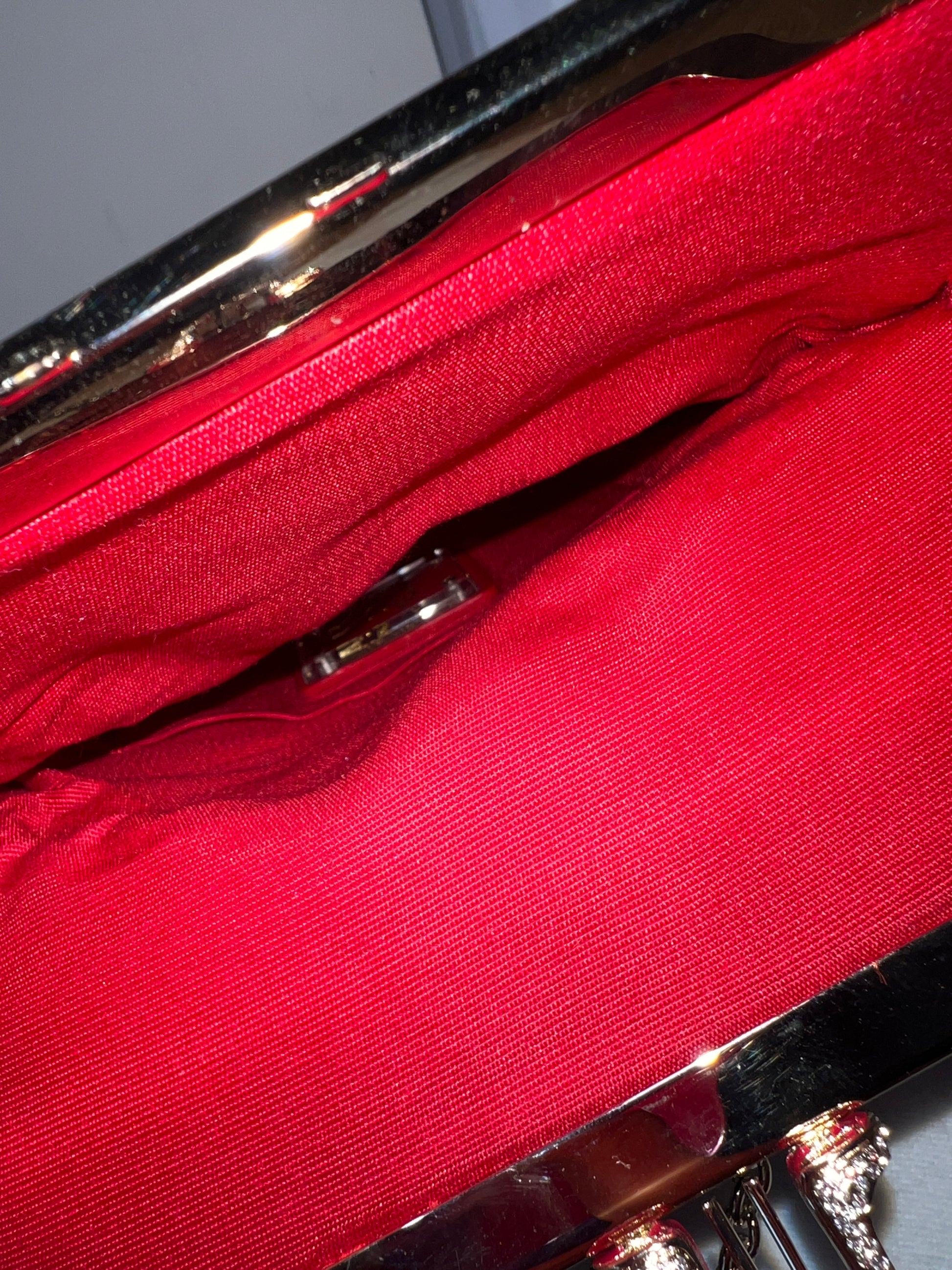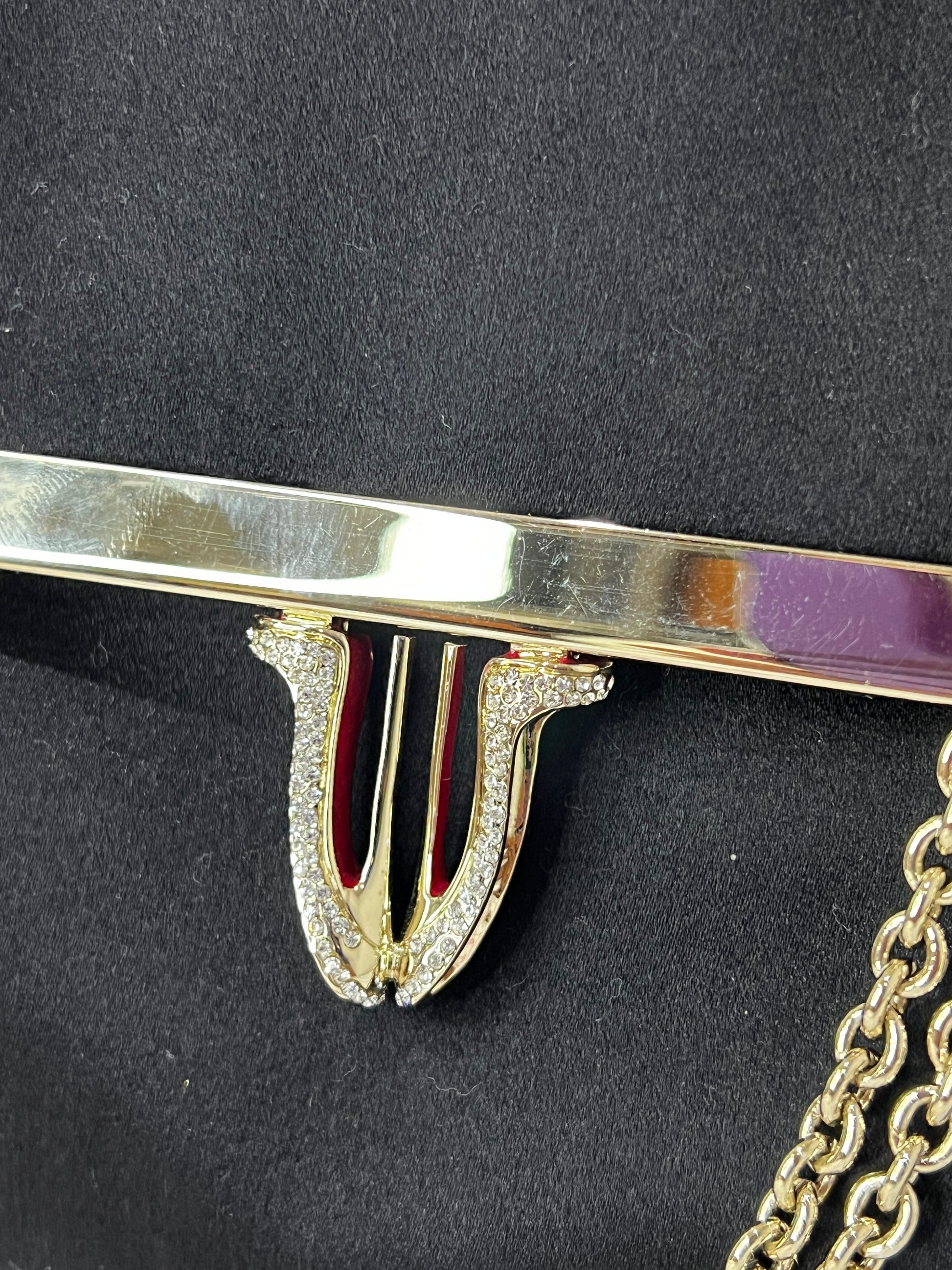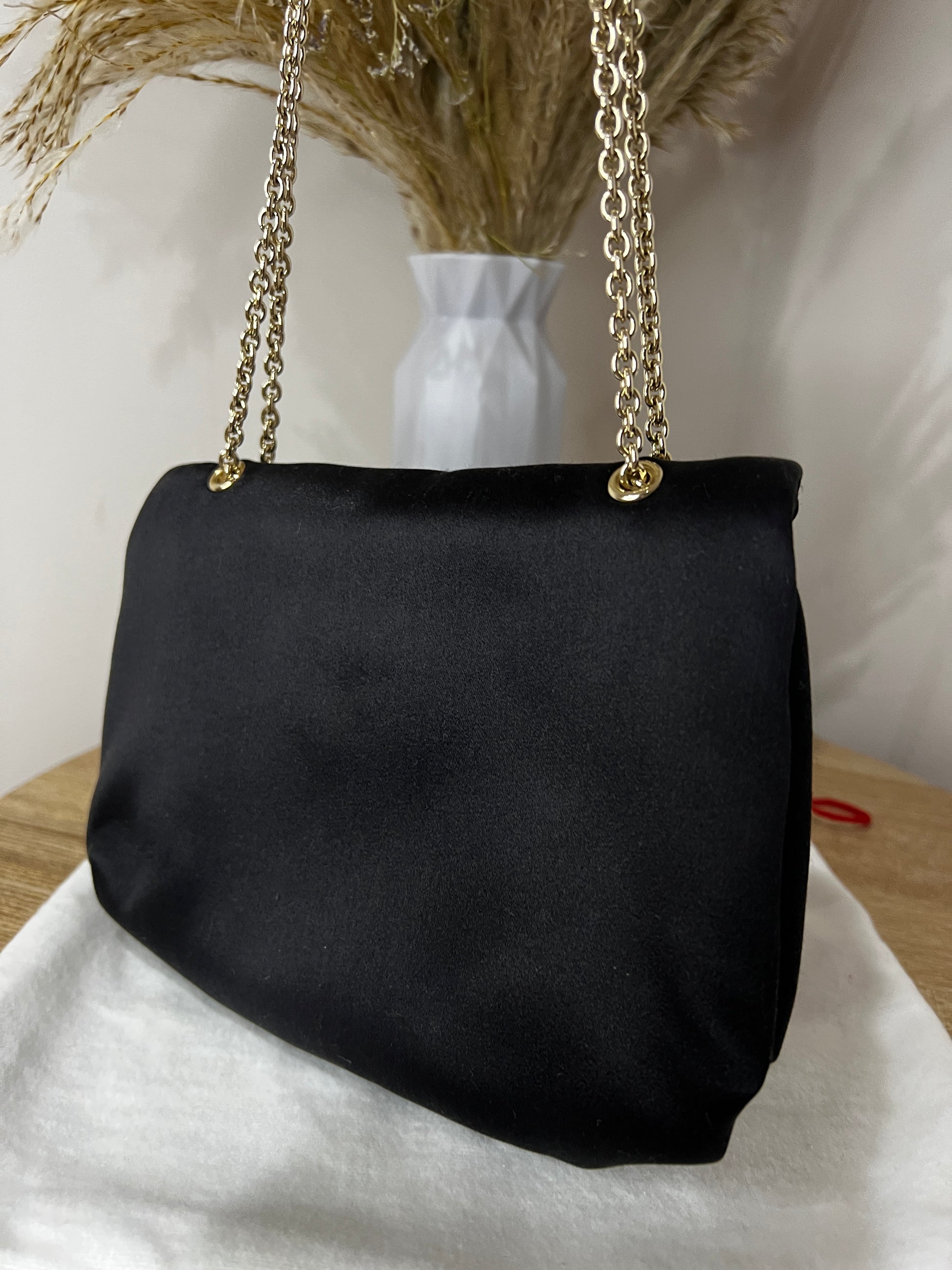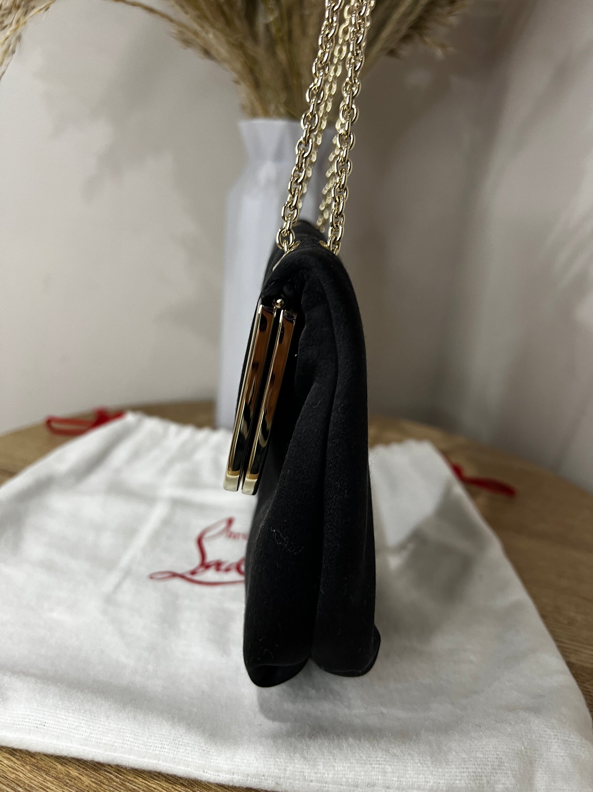 The Christian Louboutin Mia Evening Bag is an elegant statement piece, crafted in smooth black satin for a refined finish. Designed with a structured silhouette, it features a chic stiletto clasp closure and a double chain strap, allowing it to be worn on the shoulder or carried across the body. The interior is perfectly sized for evening essentials, while the signature red accents add a touch of unmistakable Louboutin glamour.