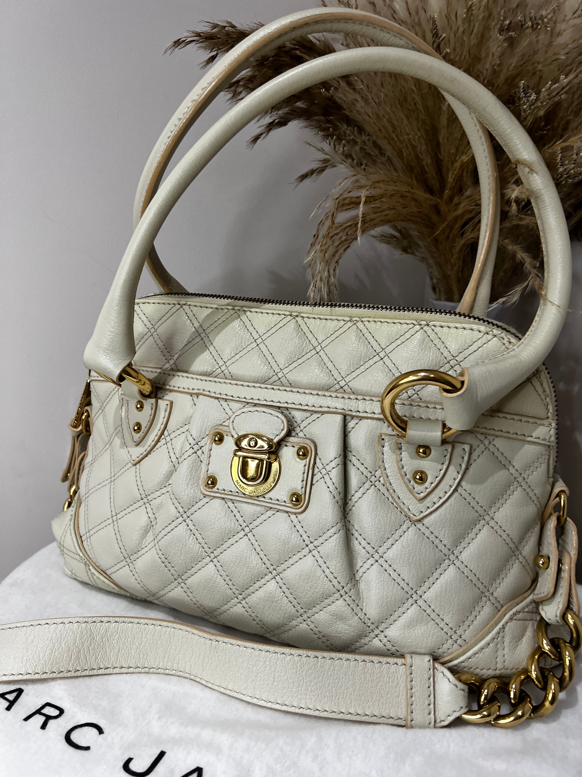 This Marc Jacobs Boston Bag in cream leather is a timeless designer handbag that blends classic style with everyday practicality. Crafted from supple leather, it features a structured silhouette, double top handles, and a detachable shoulder strap for versatile wear. The spacious interior is ideal for carrying daily essentials, making it perfect for work, travel, or weekends. Finished with subtle gold-tone hardware, this luxury satchel bag is a sophisticated choice for any wardrobe.