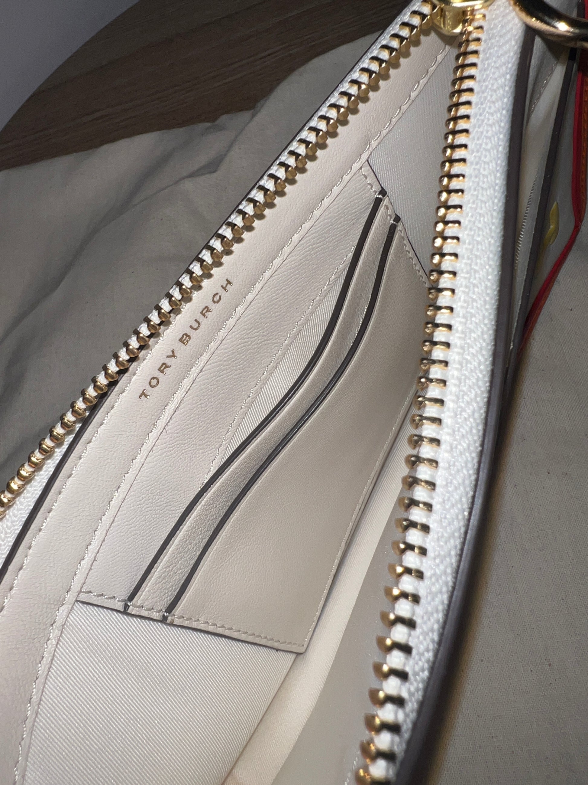 Sleek, stylish, and effortlessly versatile, the Tory Burch Perry Color Block Zip Wristlet is the perfect everyday companion. Crafted from soft leather, this compact wallet features a bold yet sophisticated color-block design with gold-tone hardware and an embossed Tory Burch logo. The zip closure opens to a well-organized interior with multiple card slots, and a slip pocket—ideal for keeping your essentials secure on the go. The wrist strap adds convenience, making it perfect for errands, evenings out, or travel.
